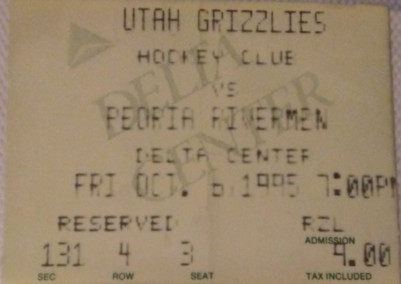 Thus, the door opened for the Delta Center to once again receive a pro hockey tenant, this time in the form of the rechristened UTAH Grizzlies. The club opened the season on the road against Phoenix on Friday, September 29, 1995, taking the Roadrunners to a shootout and earning a 6-5 victory (this was ten years before the NHL abolished the tie and instituted shootouts itself). The Grizzlies’ home opener was one week later on October 6, hosting the Peoria Rivermen at the aforementioned Delta Center.